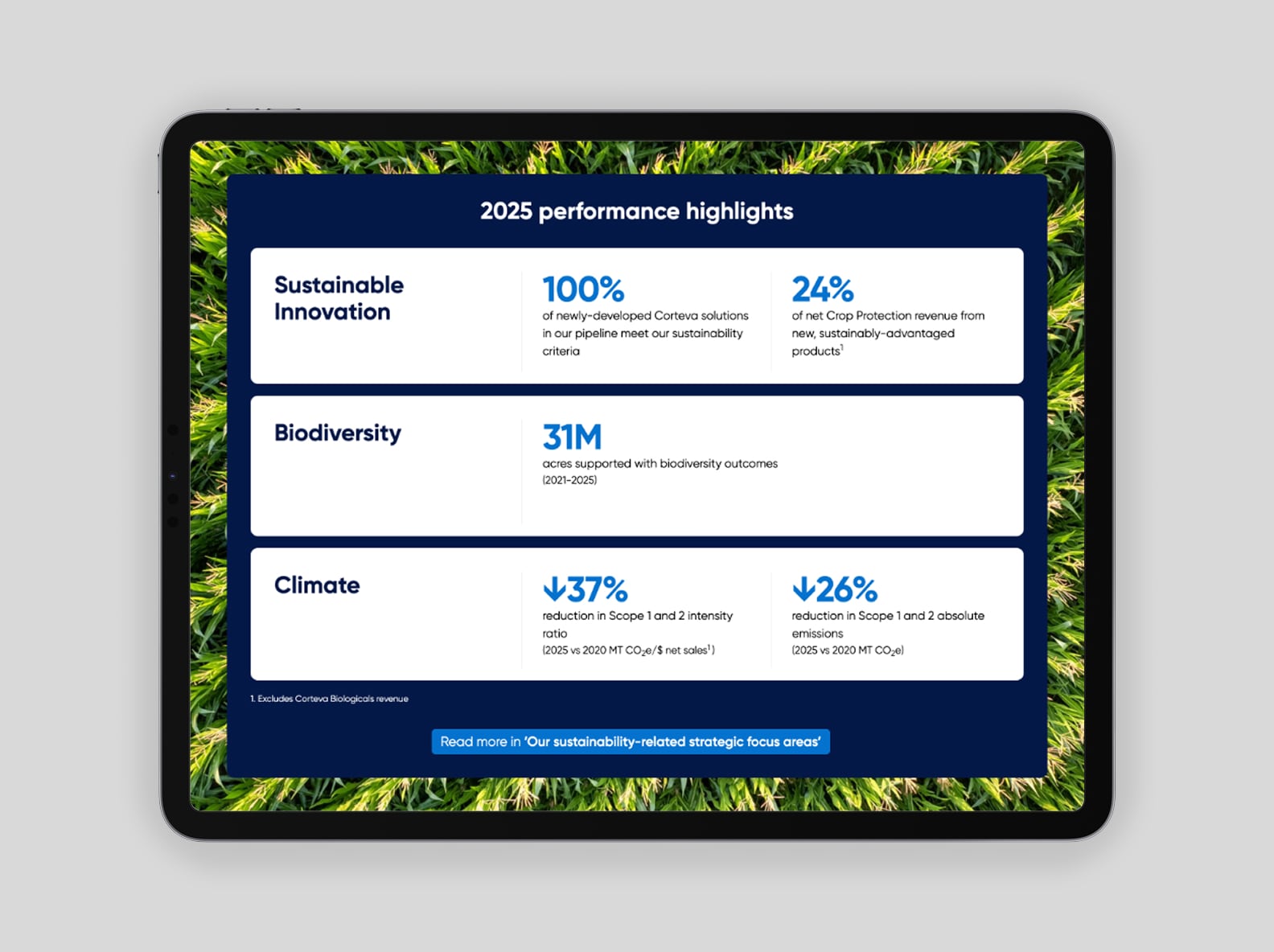 As Corteva’s report is created in digital design software, it meets online accessibility standards (WCAG) and built using native XHTML, the report content is easier to find directly from Google.