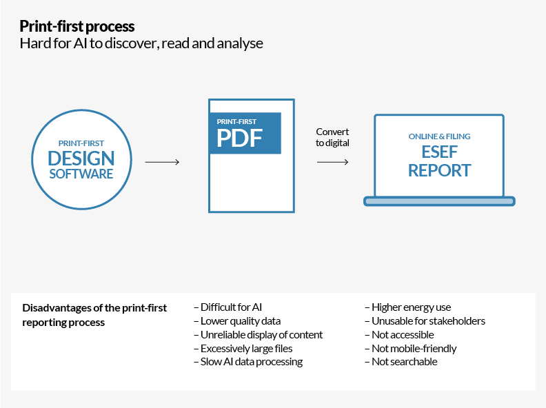 As a legacy of print-first design software, many companies still create their mandatory ESEF report by converting a print format (PDF) to digital (HTML) – known as a ‘bolt-on’ process.